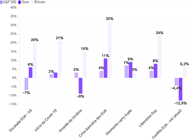 Mas um levantamento de uma exchange brasileira resolveu olhar para os dados - e não para o susto do momento. O estudo analisou os primeiros 60 dias após o início de grandes episódios de incerteza global: guerras no Oriente Médio, pandemia, tensões entre Rússia e Ucrânia e disputas comerciais.